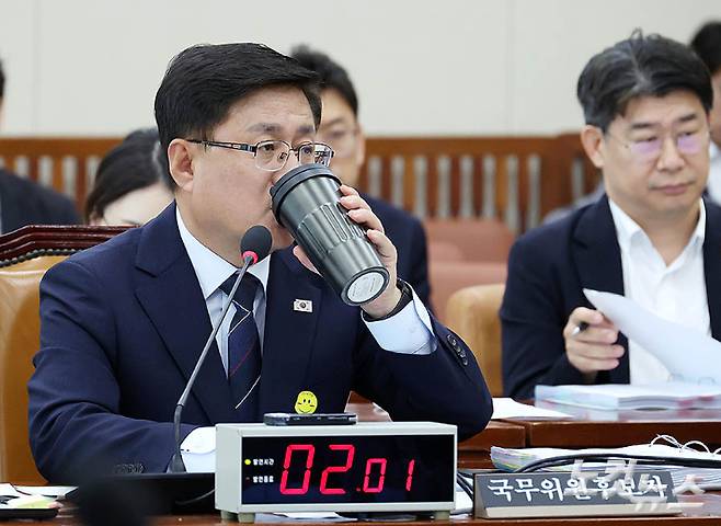 김성환 환경부 장관 후보자가 15일 오전 국회 환경노동위원회에서 열린 인사청문회에 출석해 텀블러를 사용해 물을 마시고 있다. 김 후보자를 보좌했던 한 사무관은 "항상 텀블러를 들고 다니시고, 카페에서도 음료를 본인 텀블러에 담아 드시는 게 일상이었다" 고 말한 바 있다. 황진환 기자