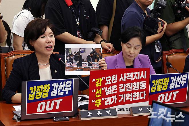 14일 국회에서 '보좌관 갑질 의혹'에 휩싸인 강선우 여성가족부 장관 후보자를 겨냥해 국민의힘 의원들은 '갑질왕 강선우 OUT'이라는 피켓을 노트북에 부착한 채 청문회에 임했다. 앞서 국민의힘 보좌진협의회는 "'강'요된 사적 지시, '선' 넘은 갑질 행동, '우'리가 기억한다"는 내용의 피켓 시위를 벌였다. 결국 청문회는 개의 후 13분 만에 정회됐다. 윤창원 기자