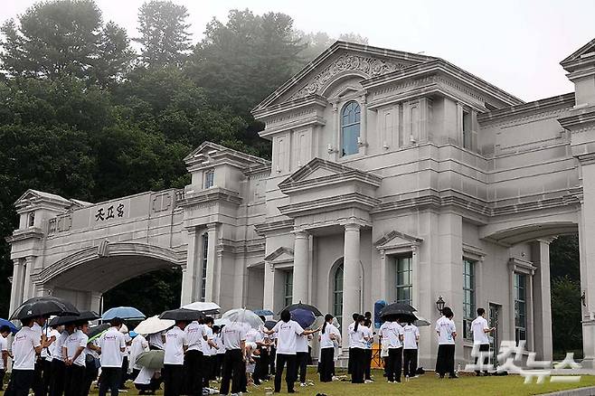 18일 오전 김건희 여사 관련 의혹을 수사하는 민중기 특별검사팀이 이른바 '건진법사 게이트'와 관련해 통일교 압수수색에 착수했다. 건진법사 게이트는 무속인 건진법사 전성배 씨가 2022년 교단 현안 관련 청탁을 받고 통일교 측으로부터 김건희 여사 선물용으로 받은 샤넬 백과 고가의 목걸이 등을 김 여사에게 전달했다는 의혹이다. 검찰이 압수수색에 나선 통일교 천정궁은 한학자 총재의 거주지로도 알려져 있다. 사진은 이날 가평 천정궁 앞에 모인 신도들의 모습. 가평=박종민 기자