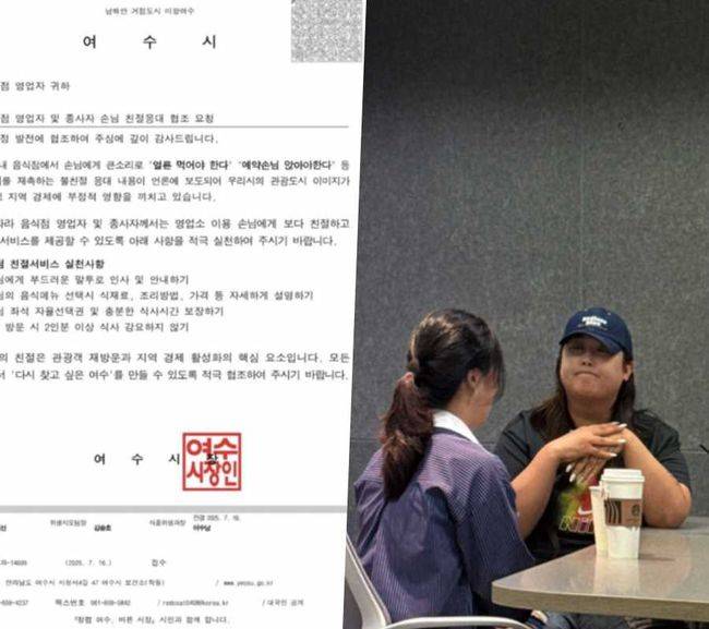 한편, 여수시는 이와 관련해 발빠른 행정 조치에 나섰다. 이석주 여수시의원은 17일 SNS를 통해 “여수시가 음식점 응대 관련 행정지도를 실시했다”며 “음식점 영업자 및 종사자에게 친절 서비스 개선 요청 공문을 전달했다”고 밝혔다. 시는 논란이 된 식당도 직접 방문해 친절 교육을 진행할 예정인 것으로 전해졌다. 이 의원은 “관광객 유입과 지역경제 회복에 있어 음식점의 응대와 서비스 품질은 매우 중요한 요소”라며 “불쾌감을 유발할 수 있는 큰소리 응대, 1인 손님 제한 등의 자제를 당부했다”고 덧붙였다.