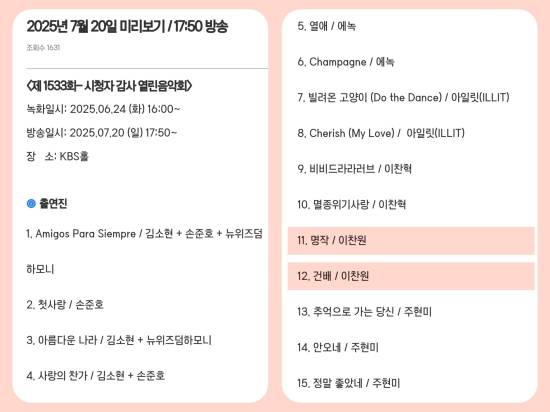 이번 방송에는 김소현, 손준호, 뉴위즈덤하모니, 에녹, 아일릿(ILLIT), 이찬혁, 주현미, 이찬원 등 다양한 장르와 세대를 아우르는 최정상급 국내 뮤지션들이 총출동한다.