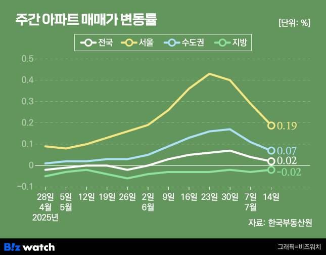 한국부동산원은 7월 둘째 주(14일 기준) 서울 아파트 가격이 1주 새 0.19% 올랐다고 분석했어요. 24주 연속 오른 거긴 한데요. 상승폭은 3주 연속 둔화하고 있어요. 전주 변동률인 0.29%에서 0.1%포인트 떨어졌네요.