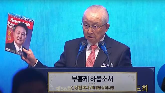 | ▲ 국가조찬기도회 설교 중 윤 대통령을 칭송하는 김장환 목사 12.3 내란이 터지기 12일 전인 작년 11월 22일 서울 신라호텔에서 열린 제56회 대한민국 조찬기도회(윤석열 대통령 참석)에서 설교를 맡아 서두에 윤 대통령을 칭송하는 발언을 하는 김장환 목사 |