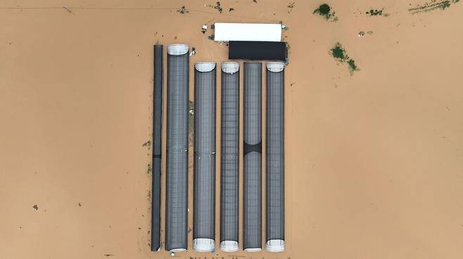 ▲ 17일 충남 예산군 삽교읍 수촌리 일대 논과 비닐하우스가 폭우로 침수돼 있다.