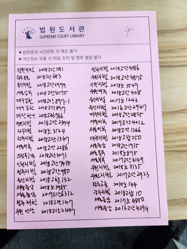 | ▲ 이성원 기자 등 3명은 무속인 범죄에 대한 법원 판결문 1990건 중 320건을 추렸다. 사진은 법원 도서관에서 사건 판결문을 적어온 것이다. |