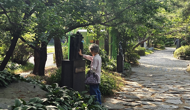 | ▲ 절두산 성당. 산책로로 조성된 십자가의 길을 따라 순교비와 조형물마다 손을 얹고 기도하는 엄마의 모습. |