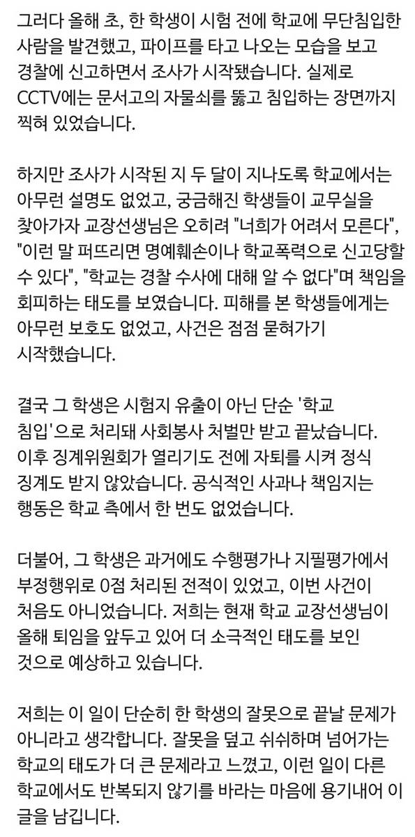 이어 “풀이가 필요한 과목에서도 시험지에는 풀이가 하나도 없이 정답만 적혀 있었고 평소 간단한 문제조차 제대로 풀지 못하는 모습을 보였는데도 성적은 계속 최상위였다”며 “선생님들과 교장 선생님께 수차례 이야기하고 문제를 제기했지만 ‘조심하겠다’는 말뿐 아무런 조치도 취해지지 않았다. 그렇게 1년 가까이 시간이 흘렀다. 올해 초 한 학생이 시험 전에 학교에 무단침입한 사람을 발견했고 경찰에 신고하면서 조사가 시작됐다”고 덧붙였다.