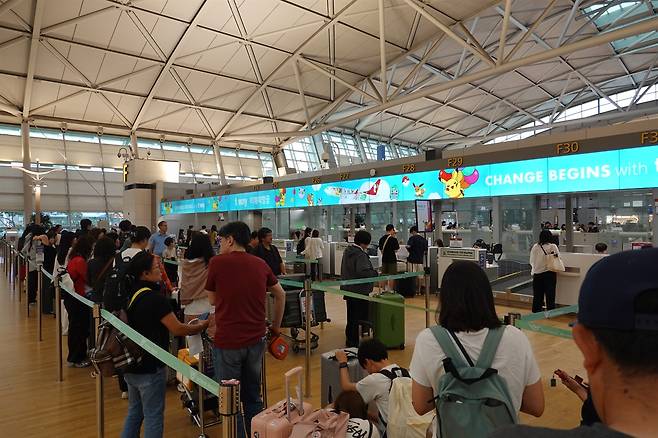 | ▲ 2025년 6월 24일 오전 인천국제공항 제1터미널 F 카운터에 티웨이항공 탑승객들이 체크인하기 위해 기다리고 있다. |