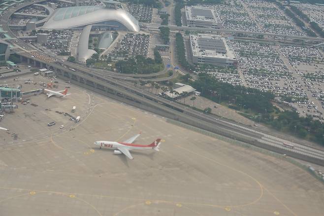 | ▲ 2025년 6월 24일 이륙한 인천발 독일 프랑크푸르트행 티웨이항공 항공편 아래로 티웨이와 제주항공의 항공기가 보인다. |
