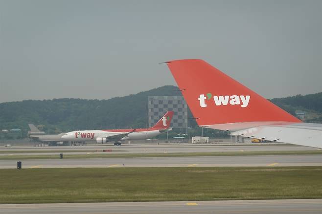 | ▲ 2025년 6월 24일 오전 인천국제공항에 우즈베키스탄 타슈켄트에서 출발한 티웨이항공 TW432편이 독일 프랑크푸르트로 출발하는 티웨이항공 TW403편 뒤로 착륙하고 있다. |