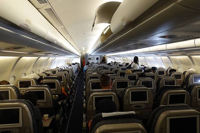 | ▲ 2025년 6월 24일 인천발 독일 프랑크푸르트행 티웨이항공 항공기(HL8211) 기내 모습. 2-4-2 배열로 배치된 좌석의 개별 모니터가 꺼져있다. |