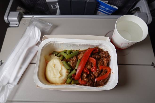| ▲ 2025년 6월 24일 인천발 독일 프랑크푸르트행 티웨이항공 항공편에서 첫 번째 기내식으로 제공된 폭찹 스테이크. 이 외에 비빔밥도 선택지로 제공됐다. |