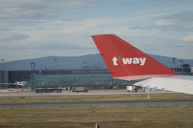 | ▲ 2025년 6월 24일 (현지시각) 인천발 독일 프랑크푸르트행 티웨이항공 항공편이 독일 프랑크푸르트 국제공항에 착륙해 택시하고 있다. |