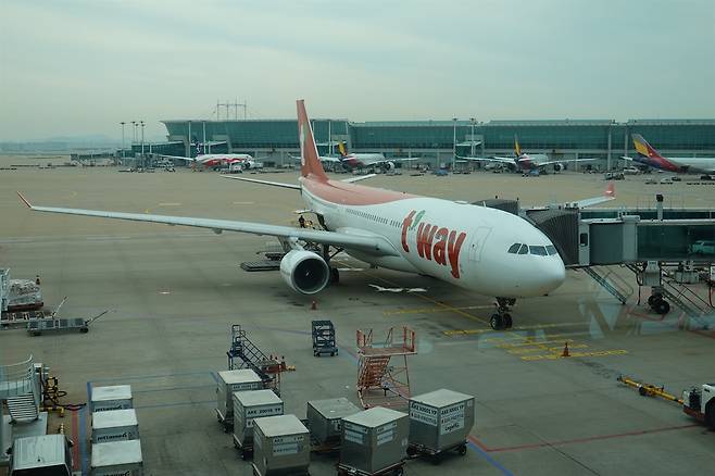 | ▲ 2025년 6월 24일 오전 인천국제공항 제1터미널 31번 게이트에 독일 프랑크푸르트행 티웨이항공 항공기가 주기돼있다. |