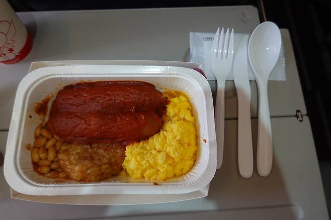 | ▲ 2025년 6월 24일 인천발 독일 프랑크푸르트행 티웨이항공 항공편에서 두 번째 기내식으로 제공된 소시지 & 에그 브런치. 이 외에 소고기죽도 선택지로 제공됐다. |