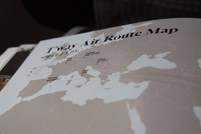 | ▲ 2025년 6월 24일 인천발 독일 프랑크푸르트행 티웨이항공 항공편에 제공된 기내 잡지에 기재된 티웨이의 항공 노선도 |