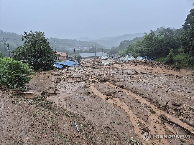 (산청=연합뉴스) 19일 오후 경남 산청군 산청읍 한 농장 인근이 집중호우로 인해 유출된 토사로 뒤덮였다. 2025.7.19 [경남소방본부 제공. 재판매 및 DB 금지]
