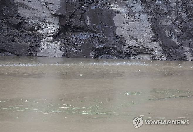 (울산=연합뉴스) 김용태 기자 = 유네스코 세계유산으로 등재된 울산 울주 대곡리 반구대 암각화가 19일 호우에 사연댐 수위가 상승하면서 물에 잠겨 보이지 않고 있다. 반구대 암각화가 침수된 것은 2023년 10월 이후 1년 7개월 만이다. 2025.7.19