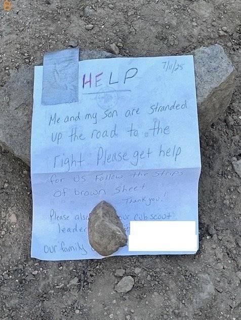 쪽지에는 “HELP(도와주세요) 나와 내 아들이 휴대전화가 먹통인 상태로 발이 묶여 있어요. 우리는 오른쪽 길 위쪽에 있어요. (쪽지를 보면) 911에 신고해 주세요. 감사합니다”라고 적혀 있었다.