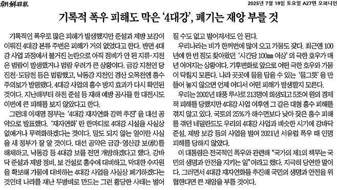 이런 상황에서 우리 사회 일부는 폭우 피해를 이용해 '4대강사업 찬가'를 부르고 있다. 대표적으로 <조선일보>가 그랬다. 19일 <조선일보>는 "기록적 폭우 피해도 막은 '4대강', 폐기는 재앙 부를 것"이란 사설을 냈다.