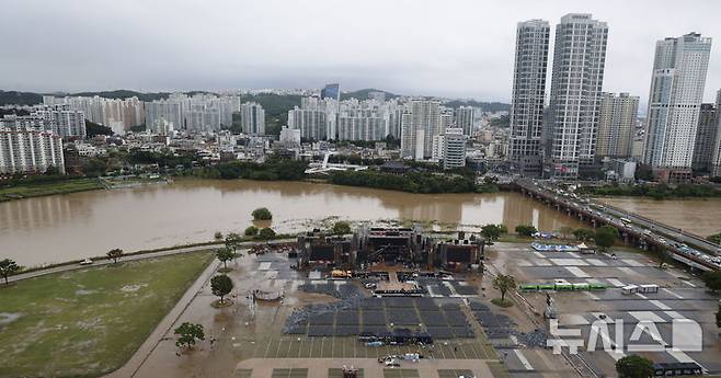 [울산=뉴시스] 배병수 기자 = 호우특보가 내려진 19일 울산 중구 태화강이 범람위기에 놓여 있다. 2025.07.19.bbs@newsis.com.