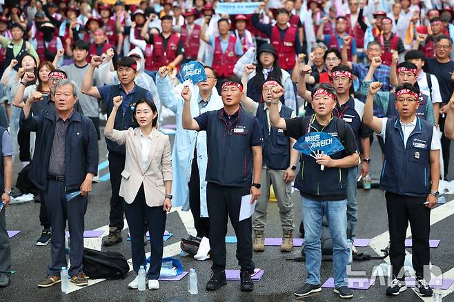 [서울=뉴시스] 최진석 기자 = 19일 서울 중구 을지로1가사거리에서 열린 광장의 힘으로 새로운 세상 쟁취! 2025 민주노총 총파업·총력투쟁 대행진에서 양경수 민주노총 위원장을 비롯한 참석자들이 구호를 외치고 있다. 2025.07.19. myjs@newsis.com