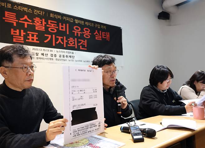 | ▲ 2023년 12월 19일 서울 중구 뉴스타파함께센터에서 열린 검찰 특수활동비 유용실태 발표 기자회견에서 박중석 뉴스타파 탐사1팀 에디터(왼쪽)와 하승수 세금도둑잡아라 공동대표가 유용사례 관련 영수증 복사본을 보여주고 있다. |