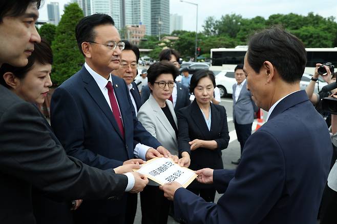 | ▲ 국민의힘 유상범 원내운영수석부대표와 김은혜 원내정책수석부대표가 4일 용산 대통령실 정문에서 우상호 정무수석에게 더불어민주당 대통령실 특수활동비 증액 추진 관련 항의서한을 전달하고 있다 |