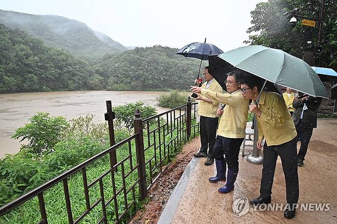 (서울=연합뉴스) 허민 국가유산청장이 19일 오후 울산 울주군 소재 '울주 대곡리 반구대 암각화'를 방문해 호우 속 암각화의 안전상태를 점검하고 있다. 2025.7.19