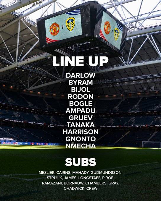 반대로 리즈는 칼 달로, 샘 바이람, 자카 비졸, 조 로돈, 제이든 보글, 이선 암파두, 일리아 그루에프, 다나카 아오, 잭 해리슨, 윌프리드 뇬토, 루카즈 은메차가 선발 출전한다.