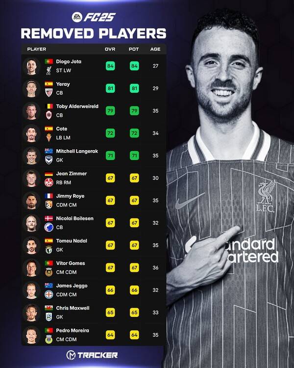 한편 조타 외에도 토비 알데르베이럴트, 마츠 훔멜스, 조니 에반스, 드리스 메르텐스, 이반 라키티치 등의 선수가 은퇴 또는 라이센스 만료 등의 이유로 FC 25에서 삭제된다.