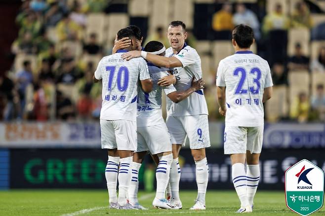 수원은 19일 광양축구전용구장에서 열린 전남 드래곤즈와의 '하나은행 K리그2 2025' 21라운드 경기에서 4대3으로 승리했다.