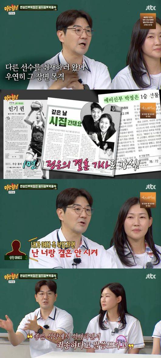 그는 "태릉선수촌에 있을 때 선물을 주러 갔다. 주차장에 기자분이 계셨다. 다른 분 취재하러 오셨다가 (우리를 본 것이다). 지하철을 탔는데 신문에 내 얼굴이 있더라. 내 얼굴은 작고 박정은(은 크게 해서) 결혼 기사가 떴다. 가족들도 몰랐다"라고 고백했다.