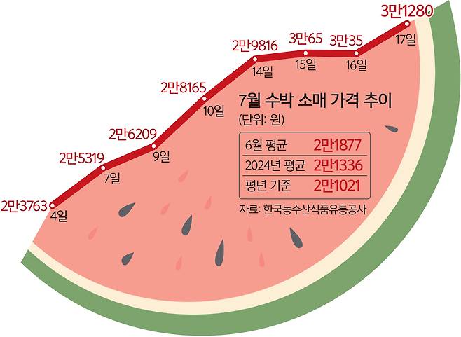 이런 정부의 마음은 아랑곳하지 않고 최근 수박 가격은 7월 기준 최고가를 경신했다. 한국농수산식품유통공사(aT) 농산물유통정보(KAMIS)에 따르면 17일 기준 수박 가격은 3만1280원으로 7월 기준 역대 최고가를 기록했다. 15일(3만35원) 7월 기준 최초로 3만원을 돌파한 뒤 이틀 만에 3만1000원대에 진입한 것이다. 이는 평년 수준인 2만1021원보다 50%가량 높은 수준이다.