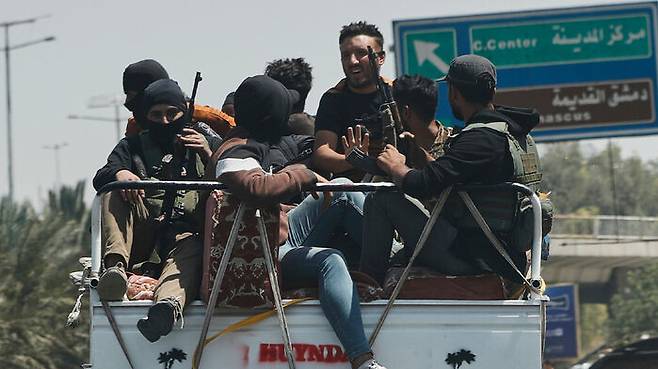 ▲ 무장한 베두인족 전투원들이 시리아 남부 스웨이다 주에서 다마스쿠스로 돌아오는 픽업트럭 뒷좌석에 타고 있다.