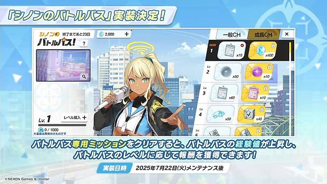 오래전부터 많은 선생님이 추가해 달라고 의견을 냈던 시즌 패스가 도입된다. 시즌 패스의 이름은 '시논의 배틀패스'다. 패스 전용 미션을 완료하면 경험치를 획득하고, 레벨을 올려 보상을 얻는 방식이다.