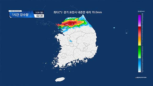 오늘(20일) 새벽 2시 31분 현재, 경기 포천시 내촌면 내리에 직전 1시간 동안 70.0mm의 매우 강한 비가 내렸습니다.