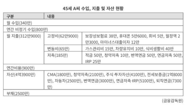 45세 A씨의 월 수입은 340만원이다. 연간 비정기 소득은 800만원이다. 월 지출은 312만9000원이다. 고정비는 보장성 보험료(38만원), 휴대폰(5만6000원), 회비(5만원), 월정액(2만3000원), 마이너스대출이자(12만원) 등 62만9000원이다. 변동비는 가스관리비(15만원), 차량유지비(10만원), 식생활비(40만원) 등 65만원이다. 저축은 적금(50만원), 청약저축(10만원), 변액연금(50만원), 연금저축(50만원), IRP(25만원) 등 185만원씩 하고 있다. 파악이 어려운 지출은 27만1000원이다. 연간 비용은 900만원이다.