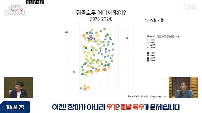 ◇ 윤신영> 그래서 저는 강수량과 관련해 관점을 바꿔야 할 때가 된 것 같아요. 과거에는 장마라고 해서 비가 집중적으로 오는 시기에 대비하는 게 중요했잖아요. 장마철 대비를 위해 인프라 점검도 하고 그랬는데요. 지금은 여름 내내 비가 퍼져 있어서, 관점을 비가 많이 오는 기간에서 비가 얼마나 집중적으로 내리는가로 바꿔야 할 것 같아요.