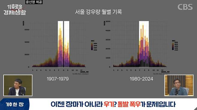 ◇ 윤신영> 올해도 그런 경향이 있는데요. 과거처럼 비가 확 내리고 그치면서 쨍하고 습한 무더위가 찾아오는 여름, 이런 패턴이 무너졌어요. 왼쪽 그래프는 1907년부터 1979년까지, 오른쪽 그래프는 1980년부터 2024년까지 서울의 강우량을 월별로 정리한 거예요. 장기 기상 기록이라고 할 수 있죠. 1980년 이전, 그러니까 왼쪽 그래프를 보시면요, 우리가 잘 아는 장마죠. 6월 말에서 7월 초중순까지 급격히 강수량이 증가하는 구간이 보이죠.