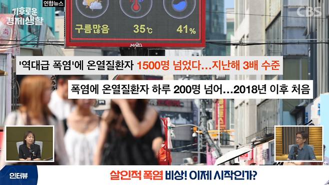 그럼 오늘은 아마 시청자들 제일 관심이 있으실 폭염에 대해 이야기해보겠습니다. 너무 더운데 지금 7월이고 이러면 8월은 어떻게 견디냐 하는 얘기 많이 나오는데요. 온열질환자나 심지어 근로 현장에서 사망자까지 나오는 상황이에요. 지금 현황은 어떤가요?