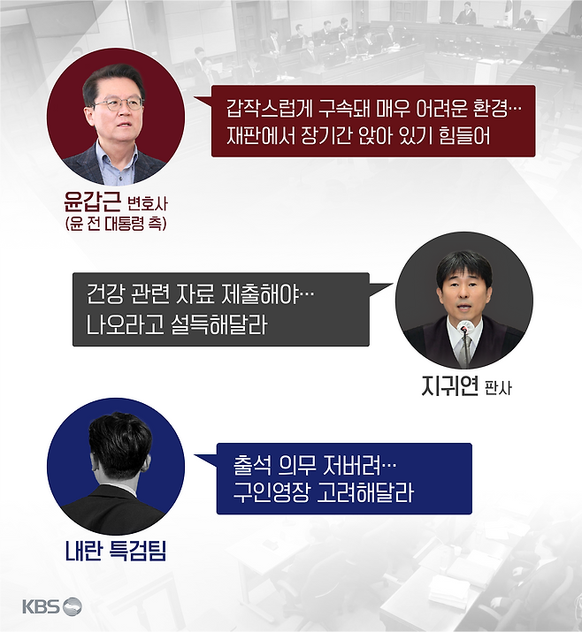 변호인단은 "(윤 전 대통령이) 어지럼증으로 구치소 내 접견실 가는데 계단을 올라가는 것조차 힘들어한다"며 "하루 종일 재판에 앉아 있기도 힘든 상태"라고 설명했습니다.