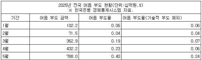 5월 어음 부도 장수는 1천장으로 평소와 크게 다르지 않았으나, 부도 금액은 총 7천880억원으로, 역시 2023년 5월(7천929억원) 이후 2년 만에 가장 컸다.