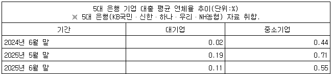 금융권에 따르면, 5대 은행의 지난 6월 말 대기업 대출 연체율은 평균 0.11%로, 작년 동월(0.02%)보다 크게 상승했다.