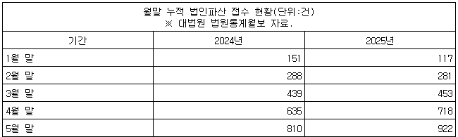 대법원 법원통계월보에 따르면, 올해 1~5월 전국 법원이 접수한 법인 파산 사건은 총 922건으로, 작년 동기(810건)보다 13.8% 증가했다.