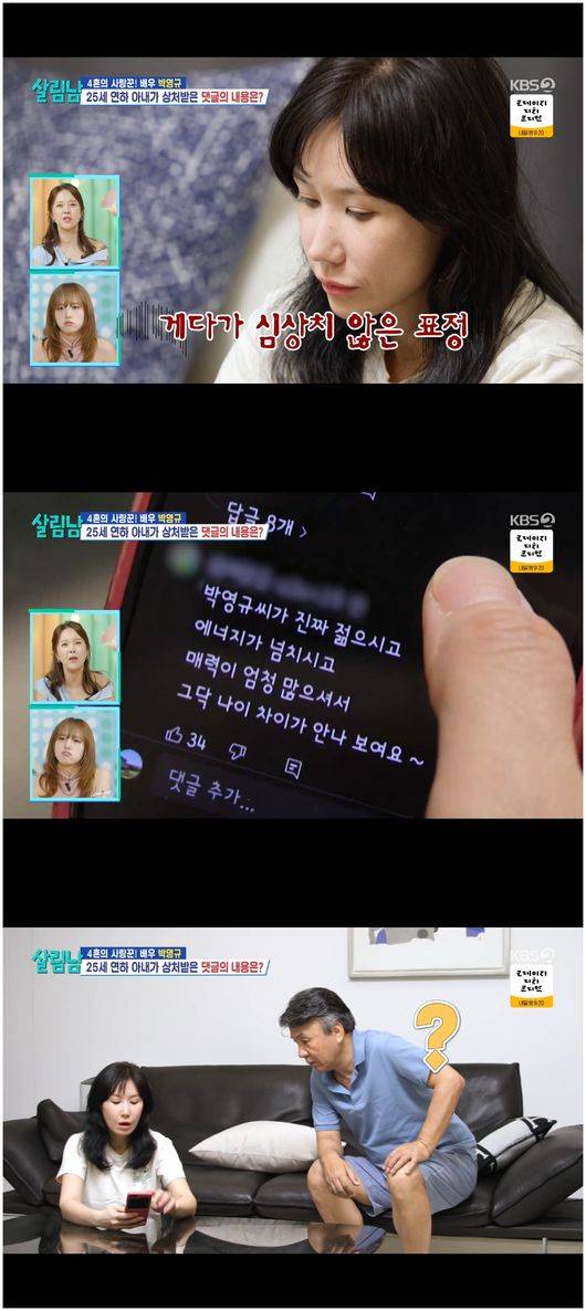 아내는 “아무래도 남편이 걱정이 된다. 연세가 있으시니. 본인의 의지와 상관없이 생길 수 있는 질환이나 병이 발견되지 않을까 싶다”라며 속마음을 털어놓았고, 박영규는 “건강검진하다가 복병을 만나면 어떨까, 나도 나지만, 힘든 걸 아내가 알게 된다고 생각하니까 상상하기가 하기 싫다”라고 말했다.