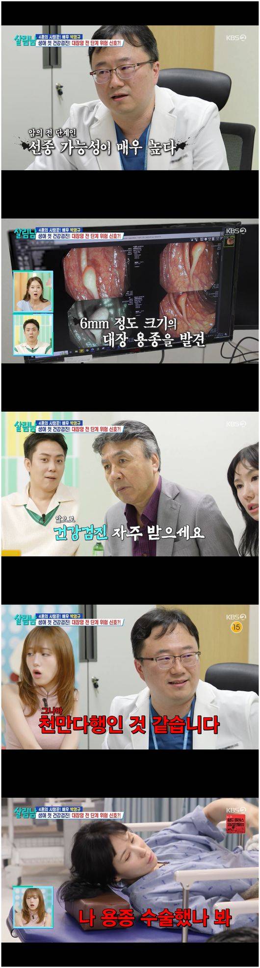 검사 결과는 충격적이었다. 무려 6mm나 되는 용종을 떼어냈던 것이다. 의사는 “박영규님은 10년 만에 검진하셨다고 하셨죠? 그나마 천만다행인 것 같습니다. 문제가 좀 있긴 합니다”라면서 “대장 내시경하길 잘했다. 6mm 정도 용종이 있었다. 내시경 소견 상으로는 암 전 단계로 보인다. 2~3년 더 방치했으면 안 좋아졌을 거다. 암 직전인 거다”라며 마저 검사가 필요하다고 말했다./osen_jin0310@osen.co.kr
