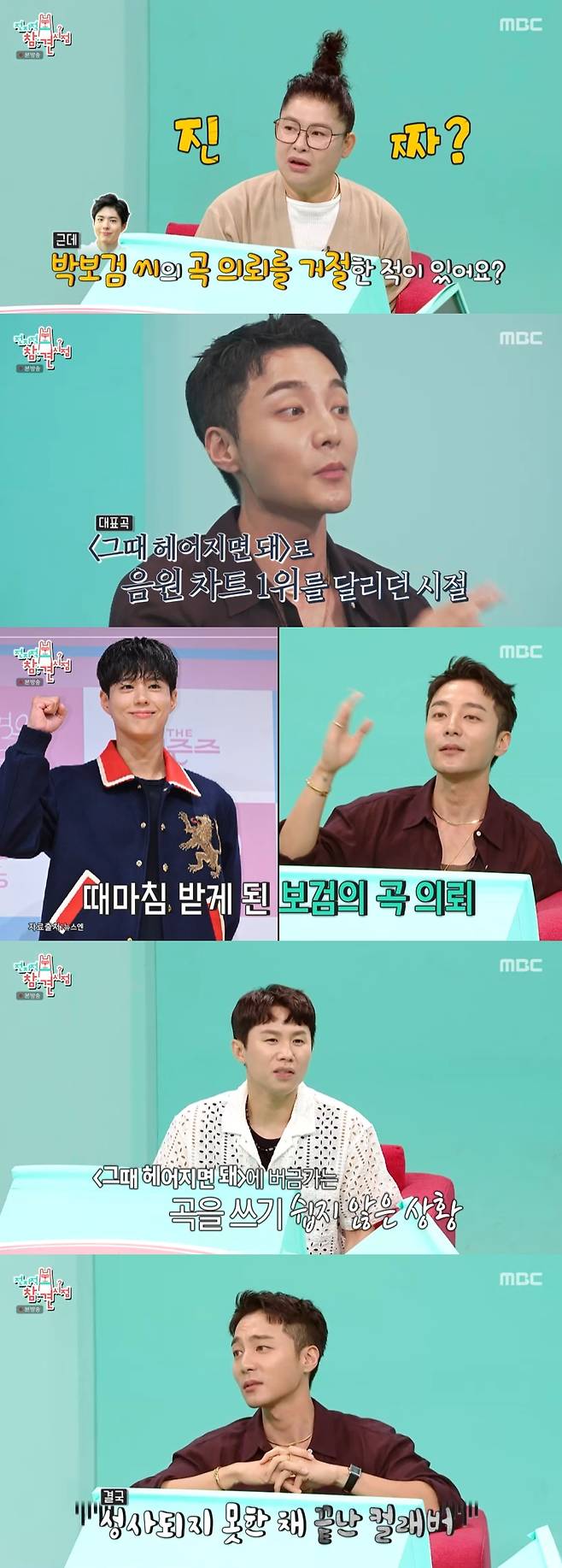 로이킴은 "그런적이 있다. 예전에 '그때 헤어지면 돼'라는 곡이 나와서 진짜 잘됐을 때 보검씨가 의뢰를 해주셨다. 그런데 그 당시에 그런 노래를 또 쓰는 게 너무 힘들고 저도 어떻게 쓰는지 모르겠었다"라고 털어놨다.