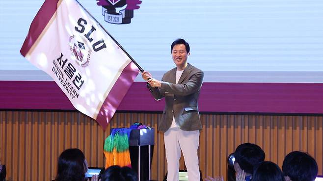▲ 오세훈 서울시장이 지난해 8월 서울 중구 서울시청에서 열린 서울런 3주년 기념 홈커밍데이 행사에서 깃발을 흔들고 있다.