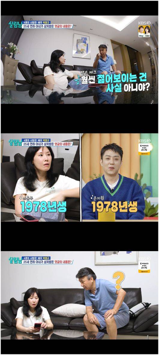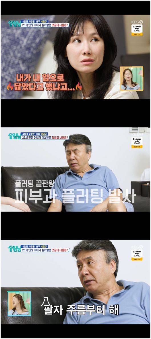 아내는 “댓글들이 나더러 60대로 보인다고 한다. 당신 눈에도 그렇게 보이냐”라며 속이 상해 물었다. 박영규는 “댓글에 그렇게 나오냐. 말이 안 되지. 그 사람들이 말한 거지”라며 시니컬하게 답했다. 아내는 “댓글에 채시라 닮았다고 하는 것도 자막이 민망하대. 내가 채시라 닮았다고 말했냐고”라며 억울해했다. 그 발언은 백지영이 한 말이었다. 백지영은 “내가 말한 거다. 그리고 진짜 닮으셨다”라며 여전히 발언 철회를 하지 않겠다고 말했다.